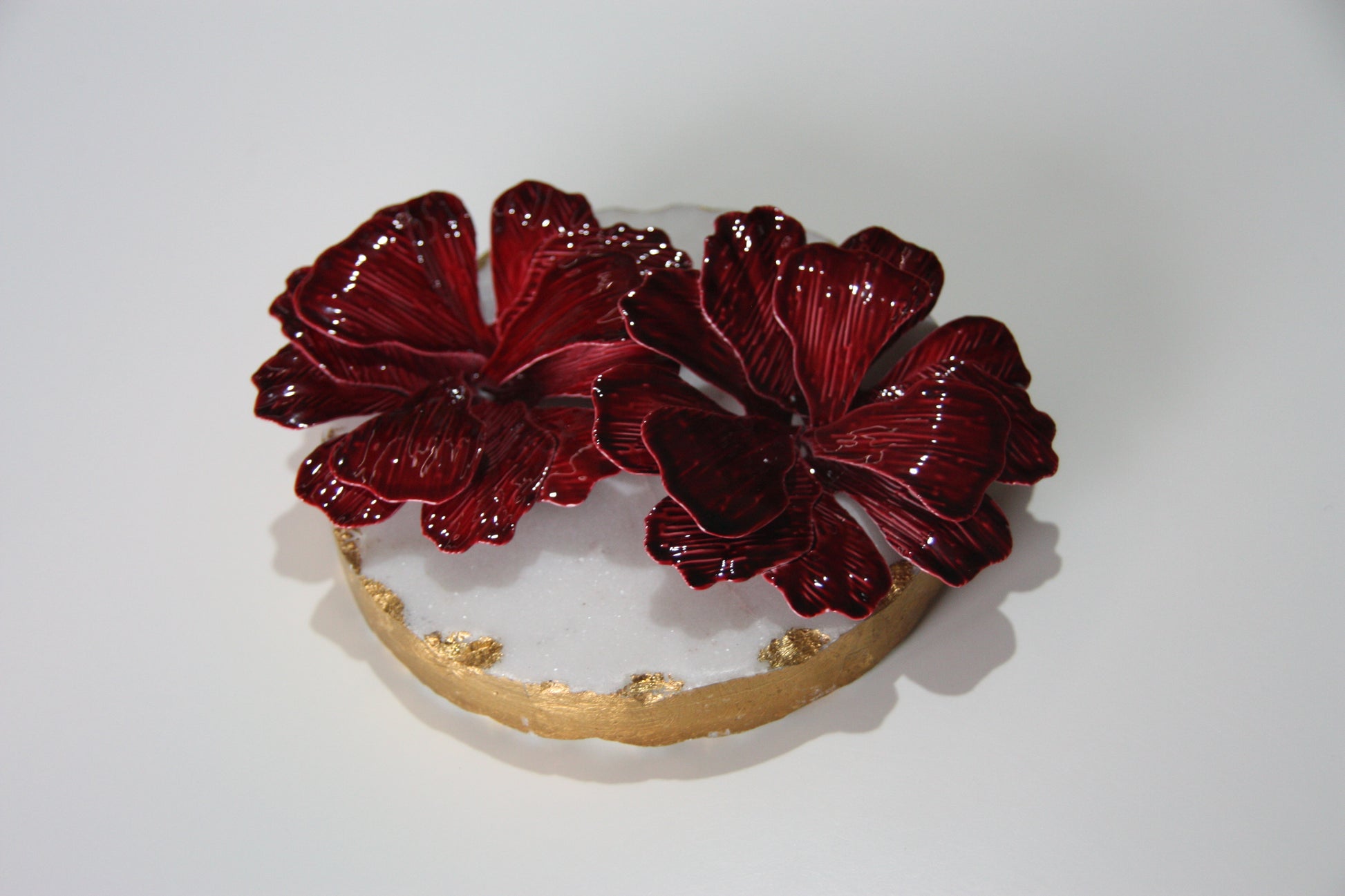 Materiales: poste en acero inoxidable 316L con baño de oro 18K + flor en resina esmaltada